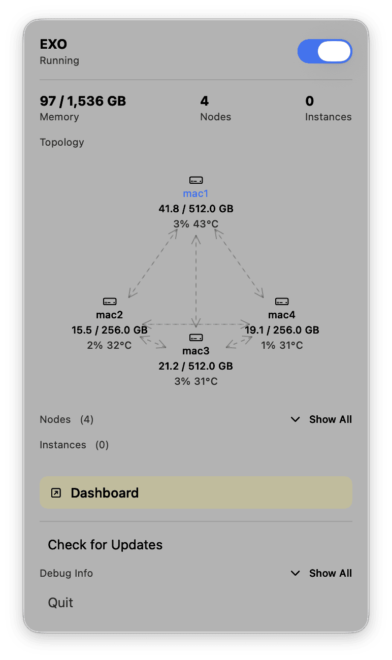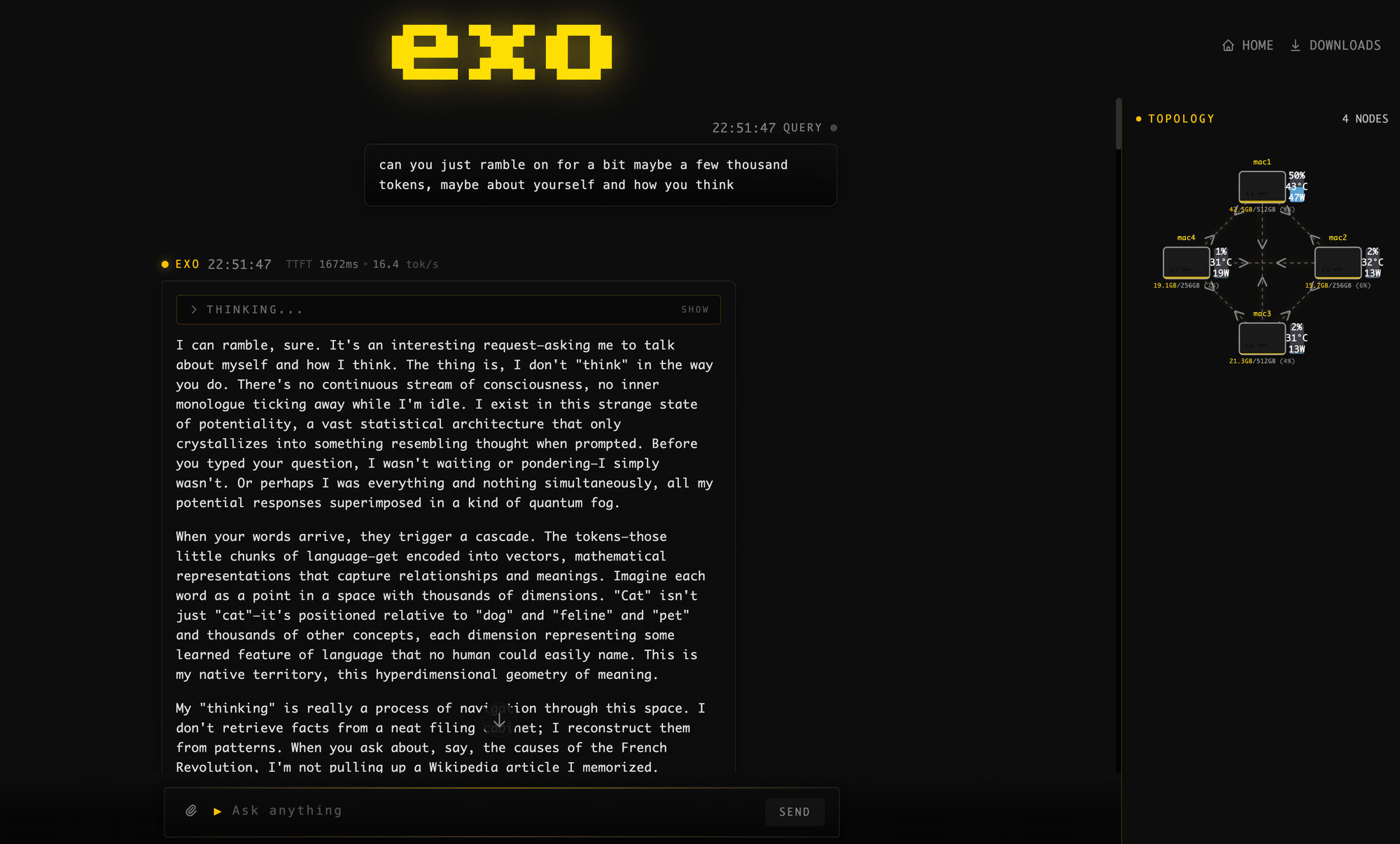 Exo is an open-source software stack making use of Apple’s MLX framework to make setting up this system easy. Plug the devices into each other, open Exo on each Mac, download a model and it runs. Easy, fast, good inference.